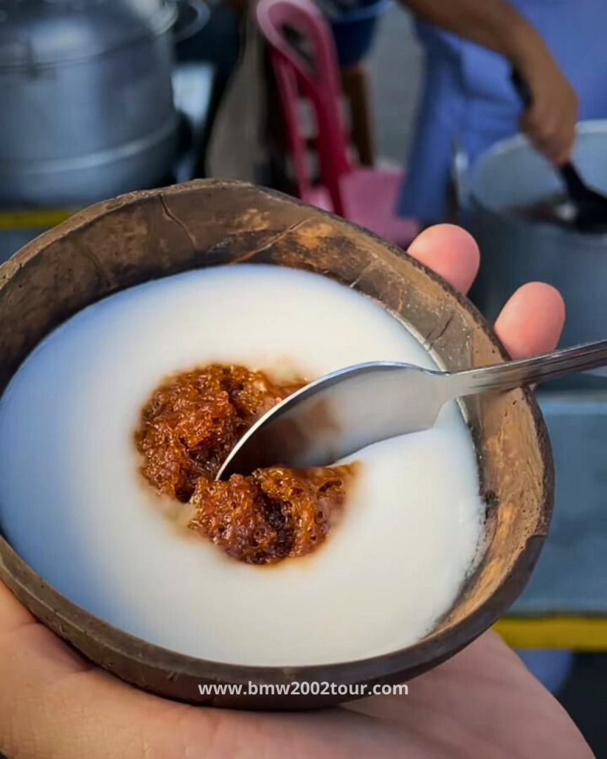 Mangkuak Sayak ialah salah satu kuih tradisional Minangkabau yang unik kerana cara penyajiannya menggunakan tempurung kelapa sini kita sebut (sayak). Perkataan “mangkuak” bermaksud mencedok atau mengambil dengan senduk, manakala “sayak” ialah tempurung kelapa. So boleh cuba langsung masa panas lah, sebab dia memang nikmat di santap saat tu. Gabungan kedua-dua perkataan ini merujuk kepada kuih yang dimasak atau dibentuk di dalam tempurung kelapa, menjadikan aroma dan rasanya sangat istimewa.